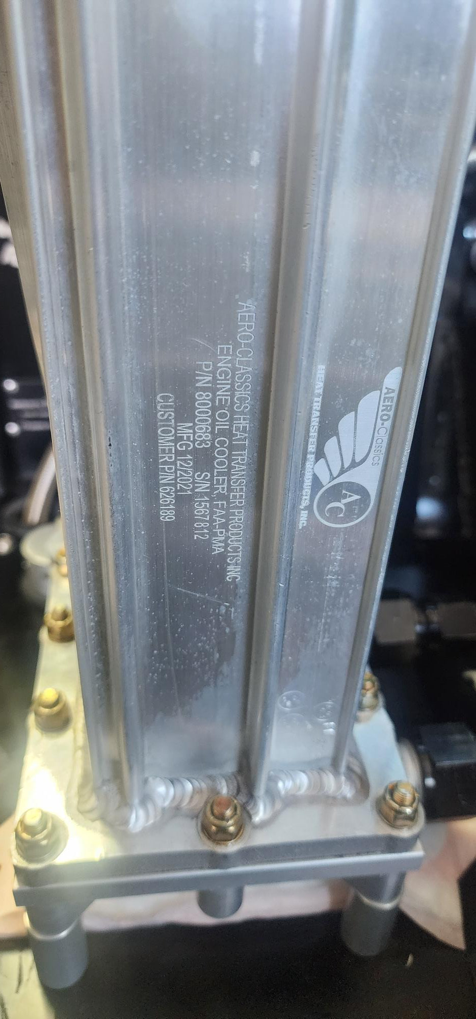 Billet manifold for a cast aluminum Aero Classics #8000683. Includes threaded male -12AN fitting inlet and outlet. Our kit also includes 1/4-28 threaded stainless spacers in either 1" or 1.375" height. The threaded spacer design allows the cooler to be removed from the car without breaking the seal. All hardware included. Custom engraving of chassis number for addition $25.