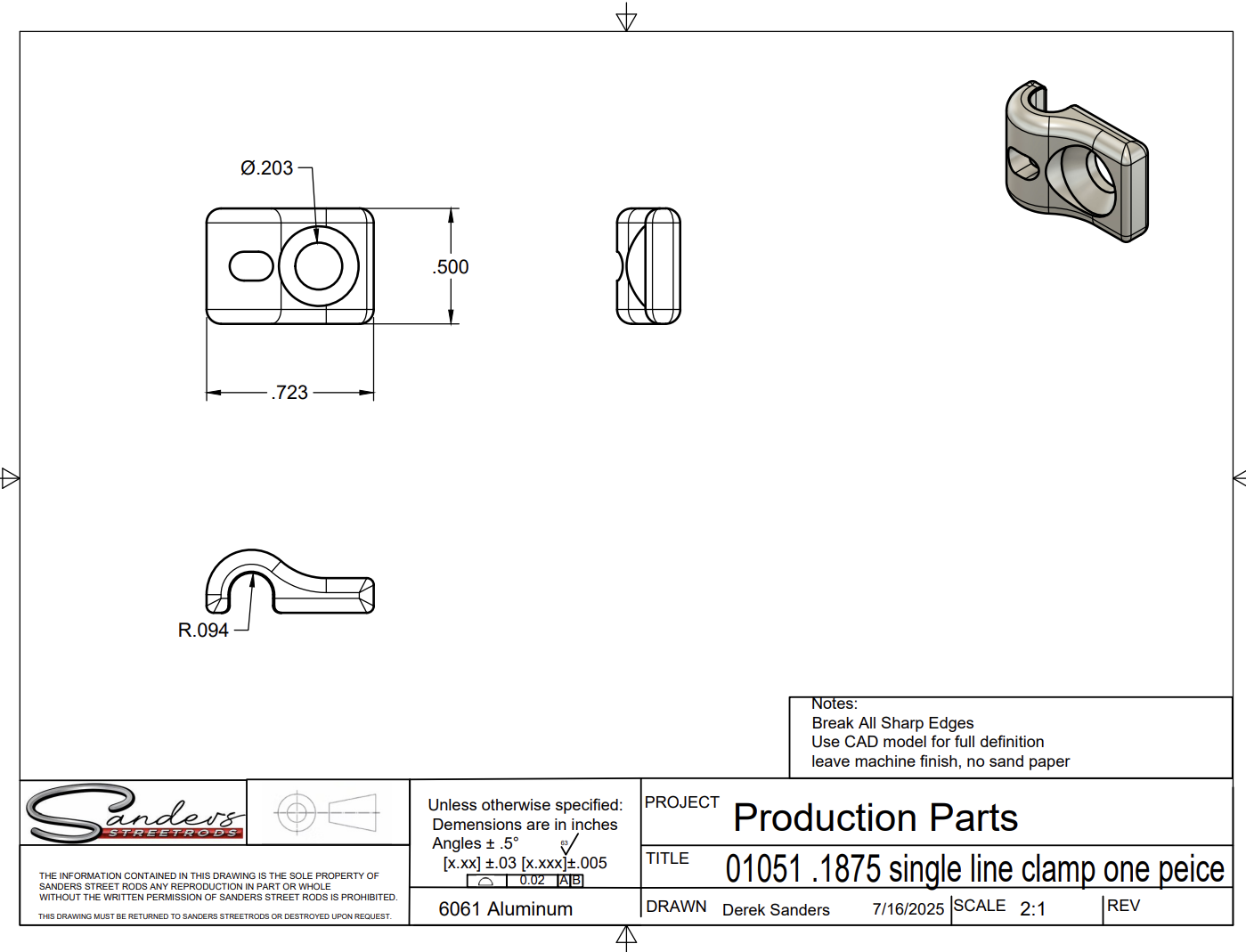 Pre-drill 3/16 line clamps are ideal for mounting 3/16 brake lines. Machined from 6061 aluminum to match the styling of our universal line clamps. Our one piece design was engineered for a low profile and low cost clamp to keep your brake lines secure. Fastened tight with a stainless steel 8-32 countersink fastener and Nylock nut. Also available in in a two piece clamp.