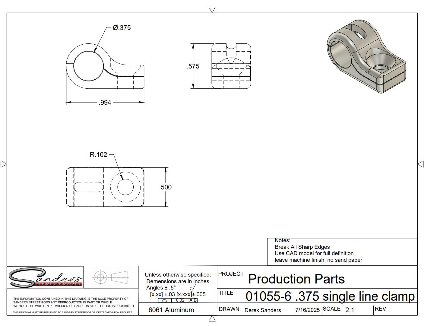 Pre-drill 3/8 line clamps are ideal for mounting 3/8 Fuel lines. Machined from 6061 aluminum to match the styling of our universal line clamps. Our two piece design was engineered for a sleek look while maintaining adequate strength to keep your brake lines secure. Fastened tight with a stainless steel 10-32 countersink fastener and Nylock nut. Also available in in a one piece clamp.