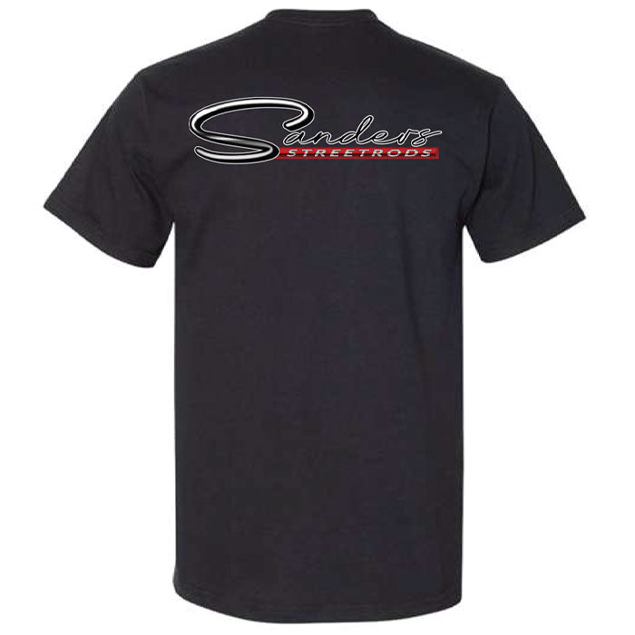 Short sleeve t-shirt in black with Sanders Street Rods 'S' on front and full logo on backside.